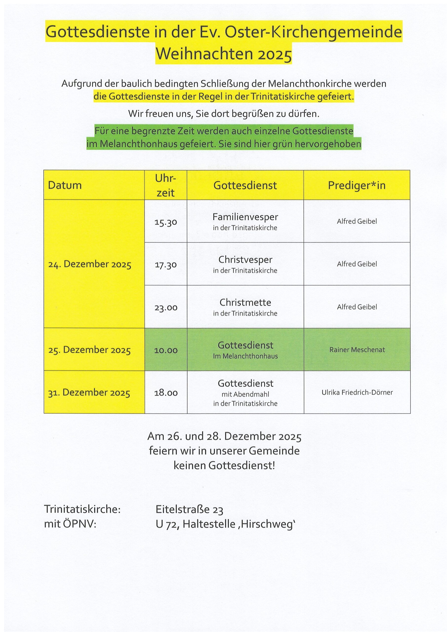 Unsere Gottesdienste an Weihnachten und Altjahrsabend